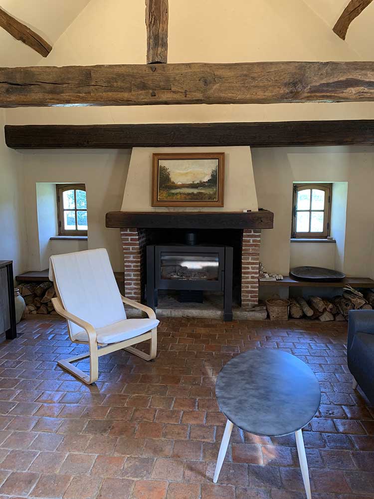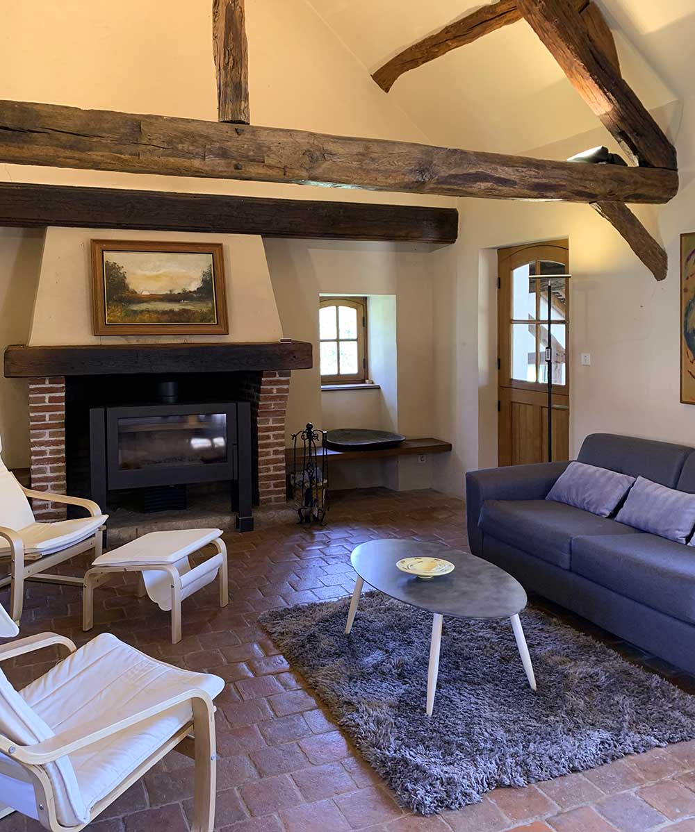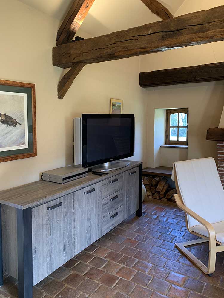 Cette maison typiquement solognote vous propose, en rez de chaussée, un très grand salon (canapé-lit double)-salle à manger avec un poêle à bois, cuisine indépendante, wc, salle d'eau.